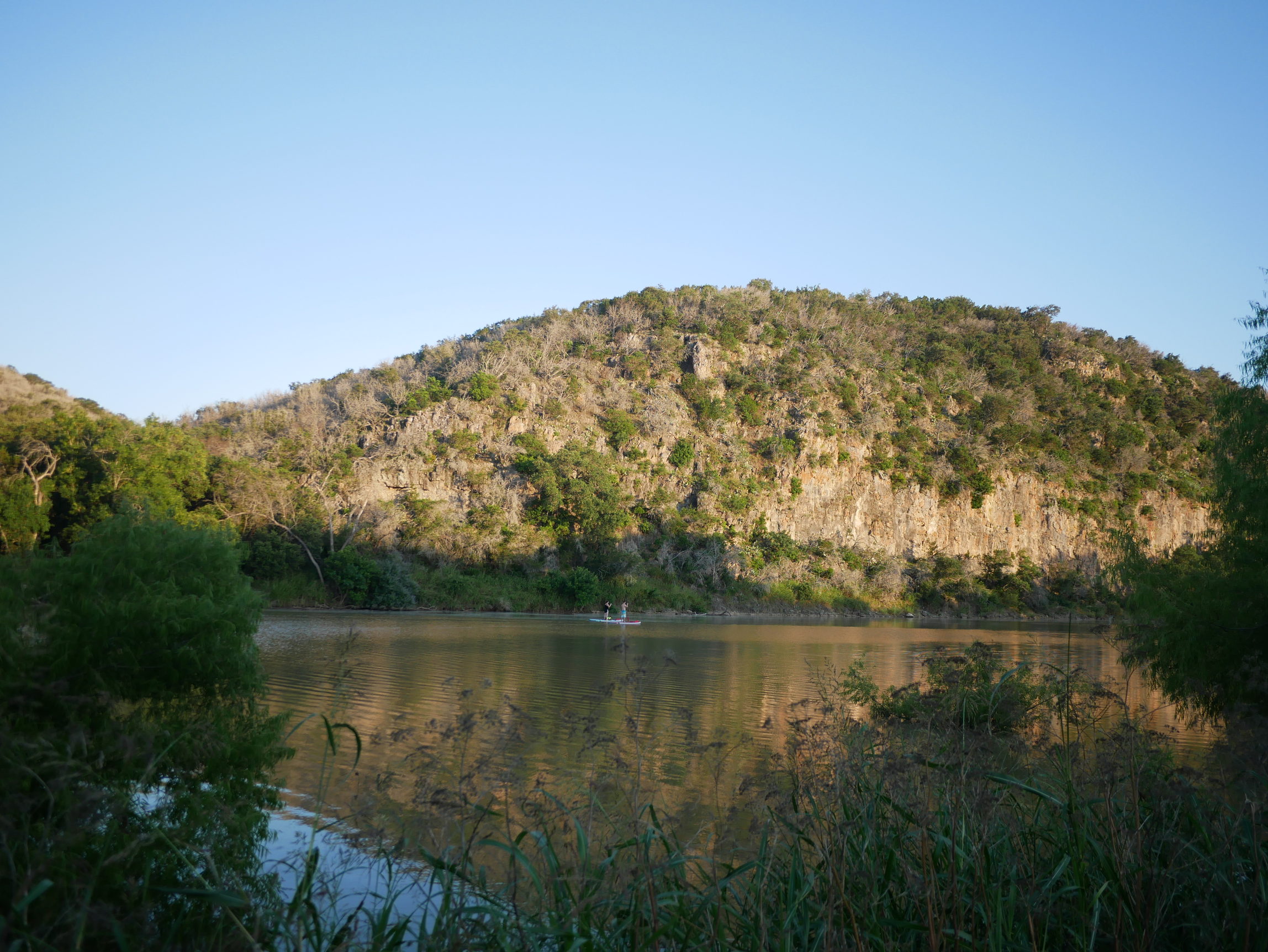 当接近出口的时候,我们对于空调的渴望达到了巅峰,也是我们最后一波加速的直接动力。上了车就直接开回营地,开始露营。搭帐篷,整理帐篷和睡眠用具的确都是小意思了,果然没有花什么时间。当一切都搞定,而气温渐渐降了下来之后,我们意识到营地的美丽,也反应过来为什么当我找到工作人员报上我们选择的营地号码的时候,他笑着说那是个好地方。眼前就是科罗拉多河,河对岸的山上除了黄绿夹杂的植被,还在这时候多了光和影的色彩。河面上时不时的过去几个水上运动的人们,有汽艇,有kayak,还有paddle board。他们要么呼啸而过,要么优哉游哉的划过。