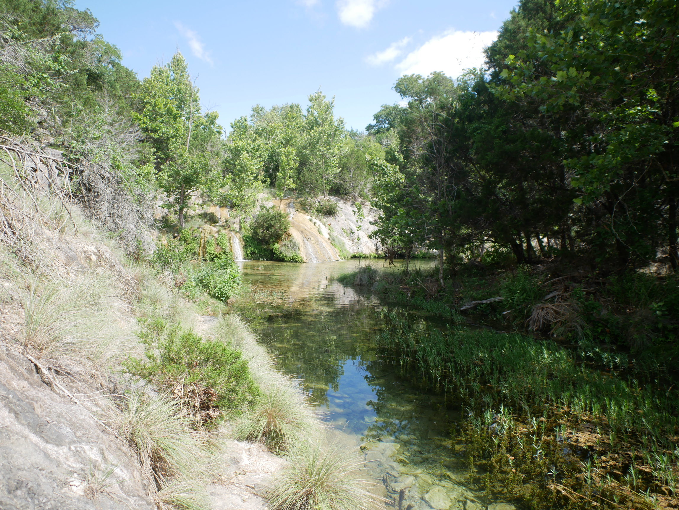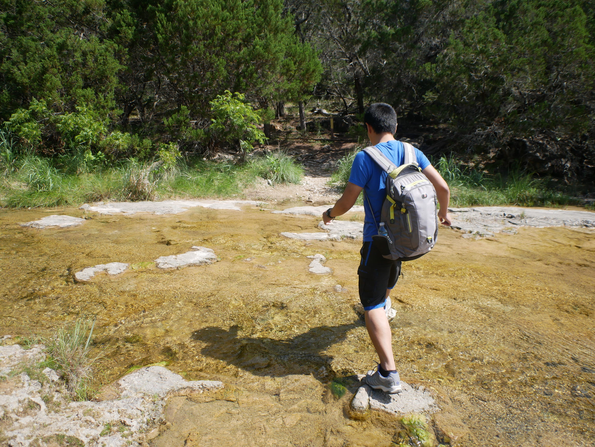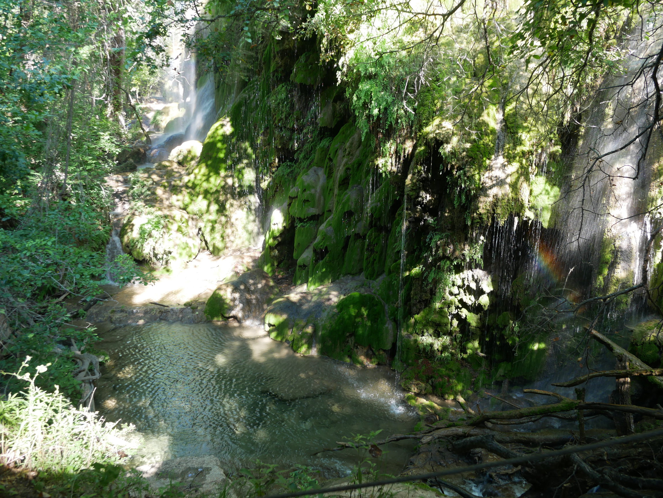 不过,到了终点的我们都十分的吃惊于瀑布的娟秀和树木之葱郁,这些都和公园其他地方的典型德克萨斯风格形成鲜明而强烈的对比。瀑布水量算是充足,毕竟在我们抵达的前一周下大雨导致进出公园的路都被淹了。青苔把岩石伪装成了葱郁的爬满山坡树丛,彩虹在手边,就在触手可及的位置,经久不变的呆着。