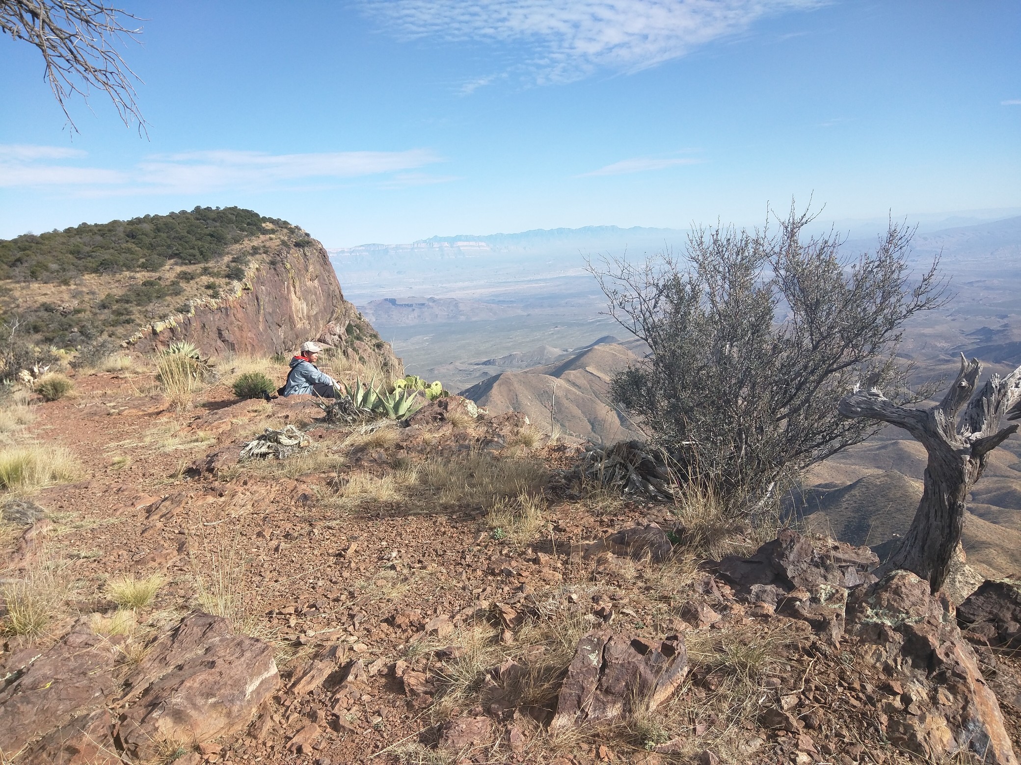 第二天的早晨天还是蒙蒙灰,我们就开车进公园。公园很大,主要就是分为沙漠区和中部的山区。我们这次的目的地是中部的奇索斯山区,所以我们需要开车穿过几十英里的沙漠区。早上我们一路看着太阳缓缓升起,看着日出把天空的蓝一点点的吞噬占领随后就是德州刺眼的阳光。路上倒是很顺利,只出现过一个伸手搭车的身影,只是天那时候还是全黑,等我们飞驰的开过时突然发现路边有人,被狠狠的吓了一跳。顾先生还提醒我,他在路上看到了郊狼(coyote)一只。我实在是不解,为什么我都没有看到过这些动物在路上呢?即使是我在开车的时候,我也没看到什么动物。