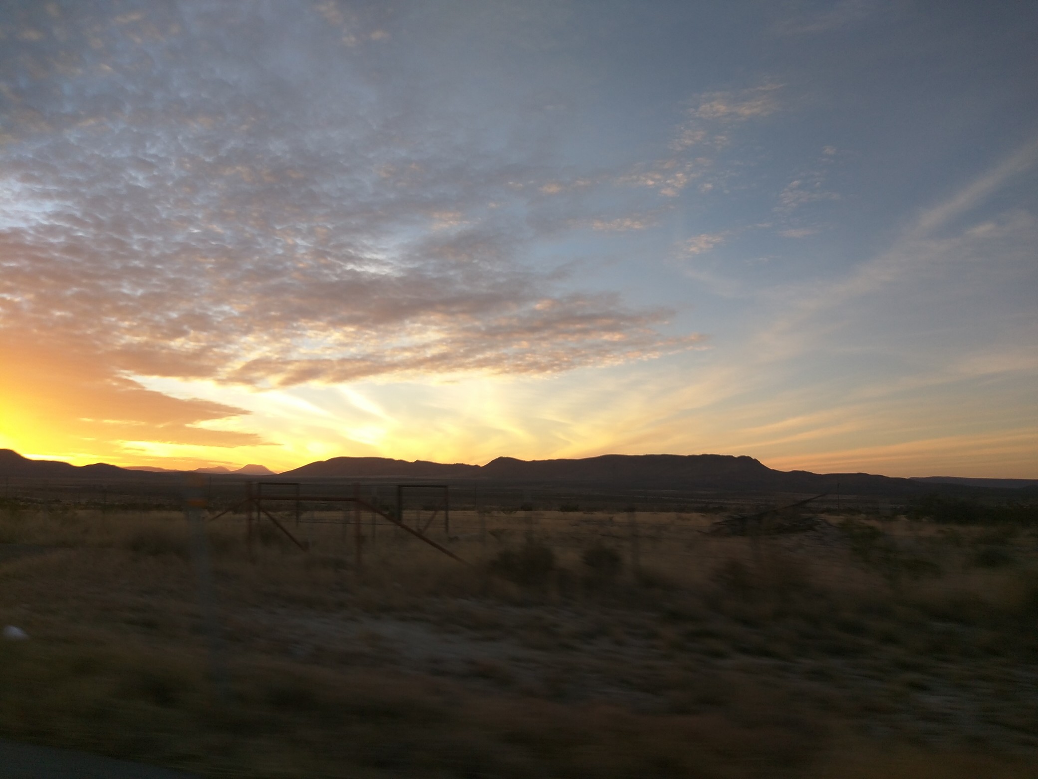 夏天的夜晚到的很早,还在路上的时候,开着太阳在我的右手边慢慢的往下落。西德州的地貌就是一座座小小的山丘,不高,但是远远看着似乎有些神秘的曲线在远方的地平线。这种夕阳是金色的,但是那天边的曲线带着灰兰。我努力的在120km/h以上车速下,打开车窗尝试着用手机在高速中拍下点什么。后来一路都想着下次绝对在车上装个GoPro相机才对得起我们一路的美景,顾先生知道我的想法后,很认真的说道:“可以装个行车记录器,现在有高像素的了,和GoPro基本没差了。”我表示“哦!”